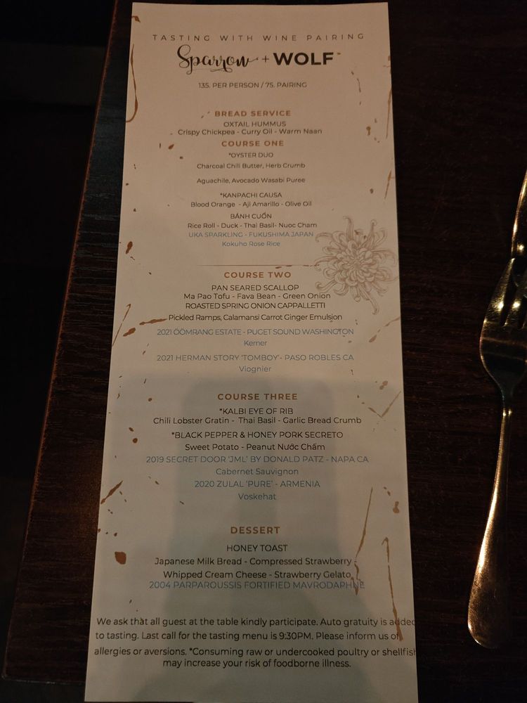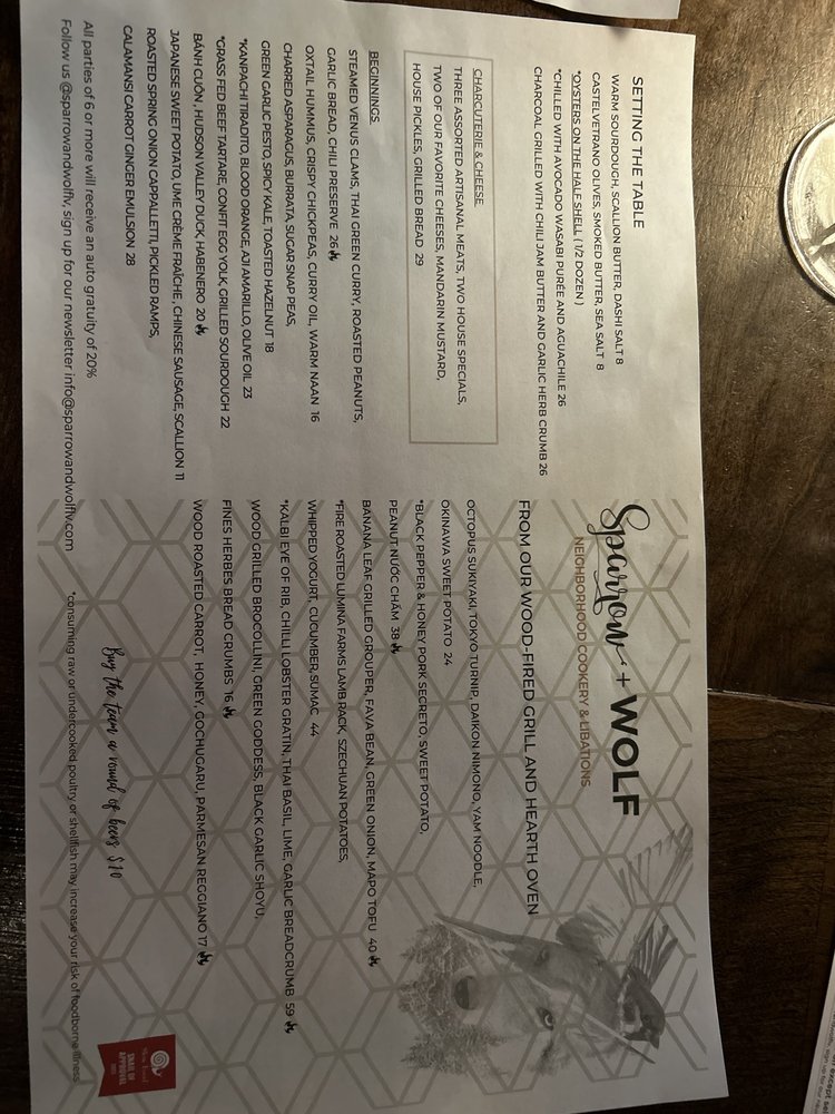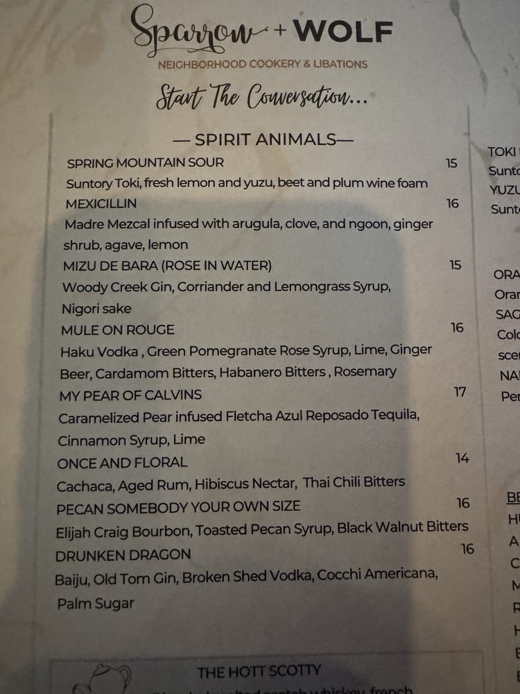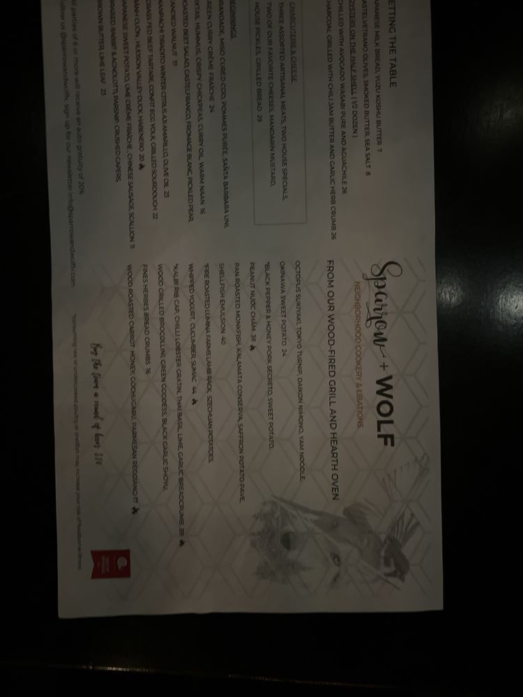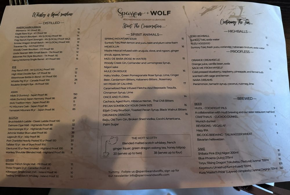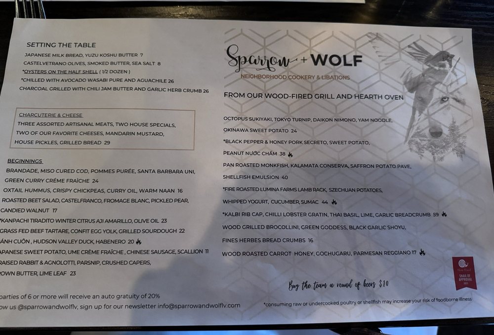 Sparrow Wolf is a trendy New American cocktail bar located in Las Vegas, offering a unique dining experience. The menu features a variety of dishes, with standout items like the Oxtail hummus, Roasted broccolini, and Fire Roasted Lamb Rack with Szechuan Potatoes receiving high praise from customers. The restaurant also caters to different dietary preferences, with vegan options available. The ambiance is described as casual yet classy, with a friendly and attentive staff. Guests can enjoy a full bar, outdoor seating, and private dining options. Overall, Sparrow Wolf impresses with its creative and flavorful dishes, making it a must-visit spot for those looking for a memorable dining experience.